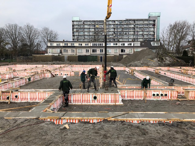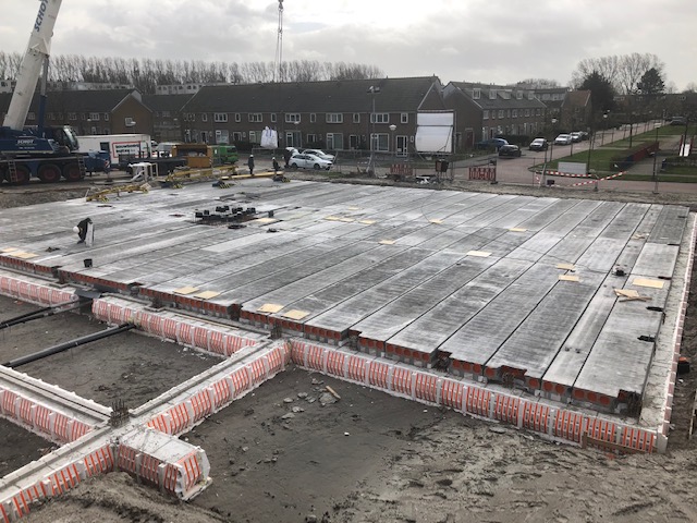 Na 72 uur zijn de pre-fab vloerplaten op de fundering geplaatst. In totaal zijn er 126 pre-fab vloerplaten gelegd.