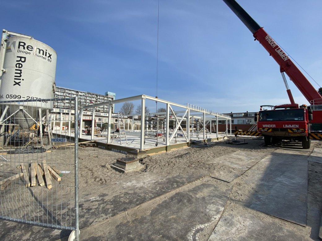 Wk. 16 staalconstructie gymzaal en leggen prefab vloer 1e verdieping van de school