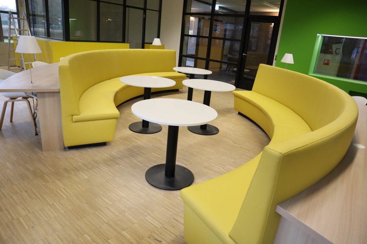 Voor het bouwgedeelte zijn de wanden vervangen door moderne glazen wanden. Interieurbouw heeft het lokaal aangekleed met kastenwanden, een tribune, de ronde bank (denktank), tafels, wandmeubels en een verrijdbare keuken.